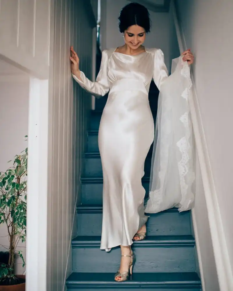 Long Sleeve Boat Neck Ankle Length Silk Satin Wedding Dress Bride