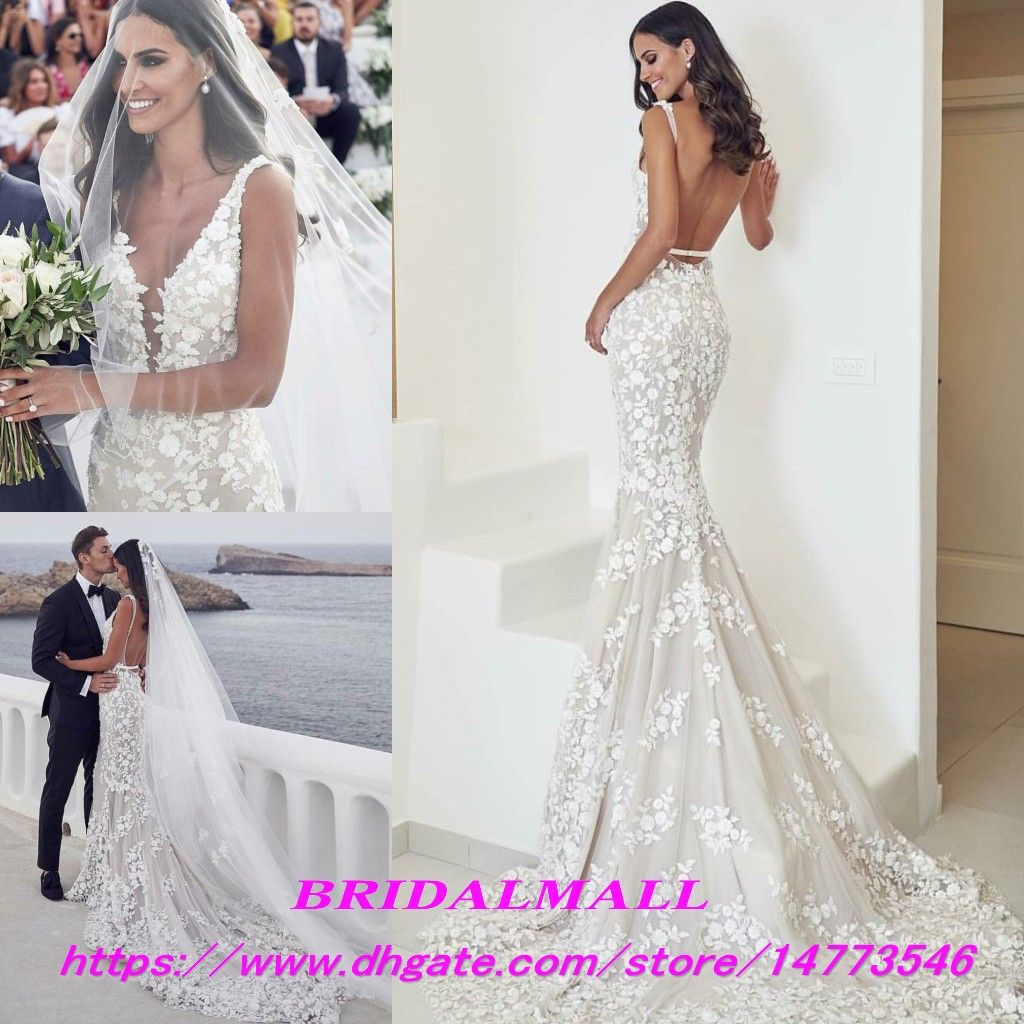 V Neck 2019 Elegant Appliqued Lace Mermaid Wedding Dresses Sexy