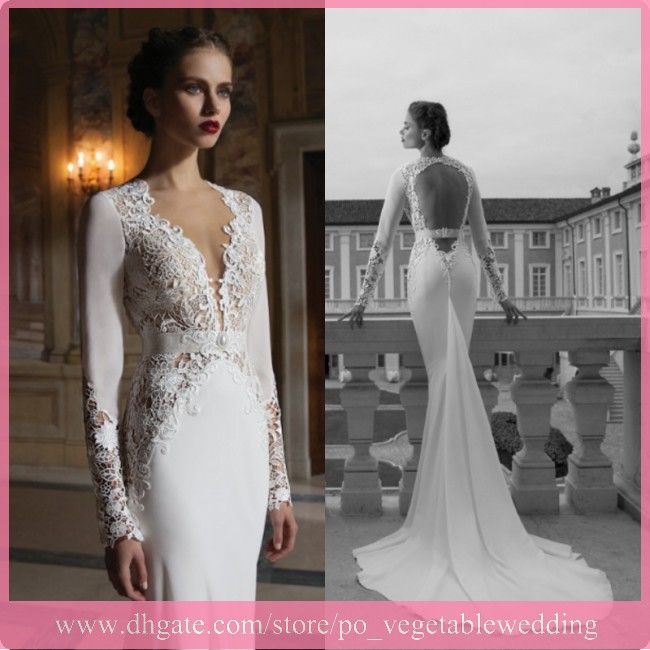 Sexy Chiffon Berta Wedding Dress Lace Long Sleeves V Neck Mermaid