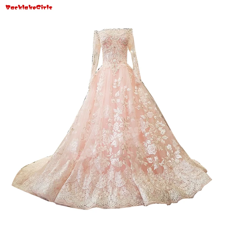64345 Pink Embroidery Wedding Dress Boat Neck Embroidered Flower