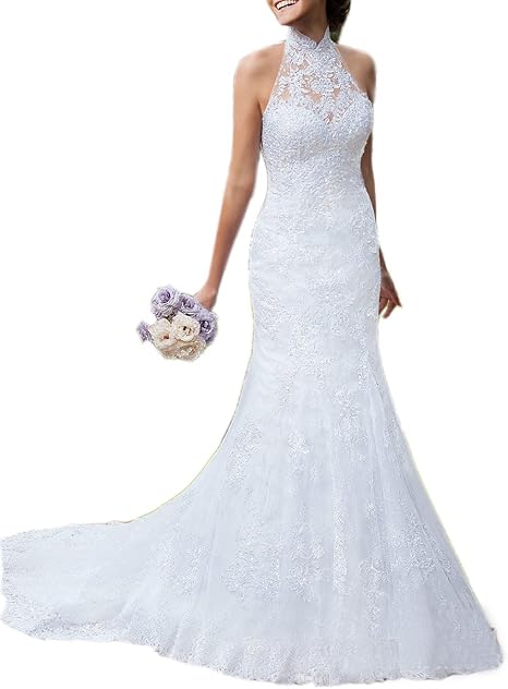 Ikerenwedding Women S High Neck Halter Sleeveless Lace Mermaid
