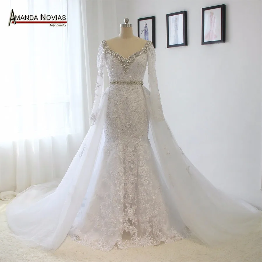 Real Photos V Neck Long Sleeve Lace Rhinestones Crystal Wedding