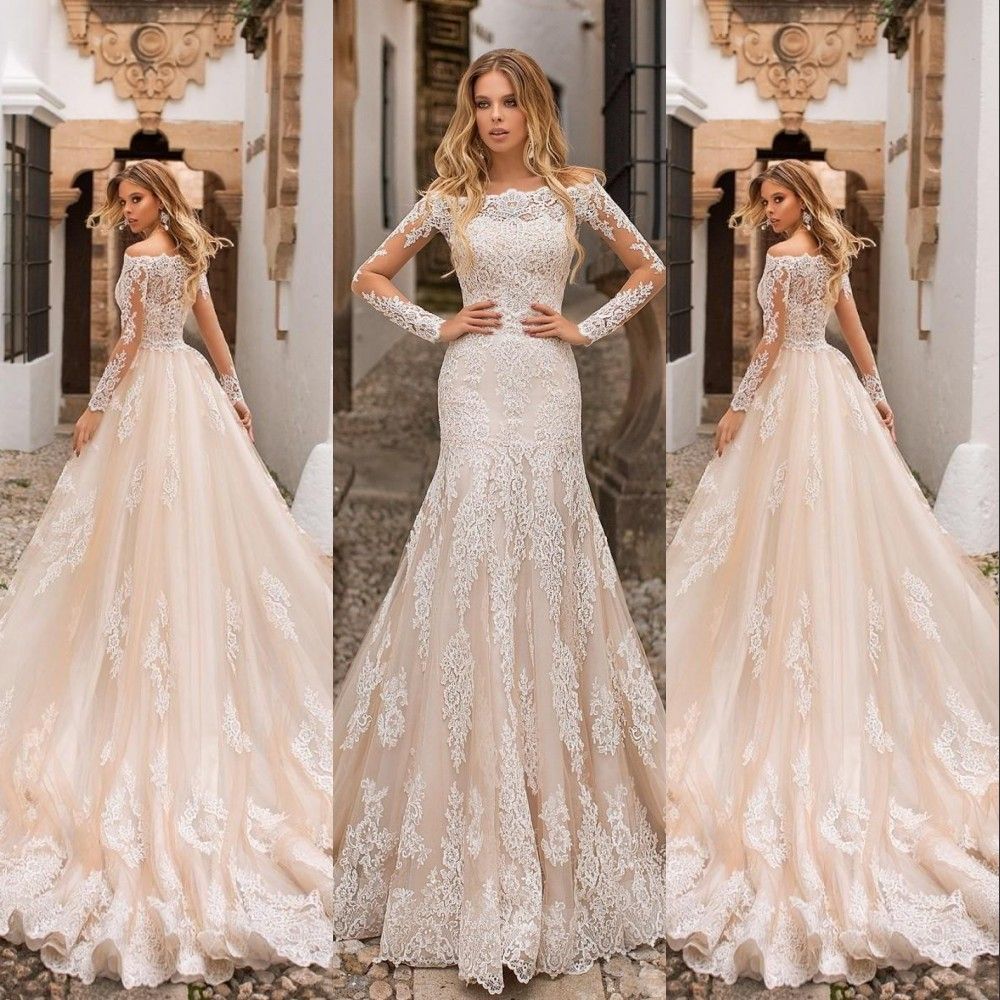 Champagne Lace Long Sleeves Mermaid Wedding Dress With Detachable