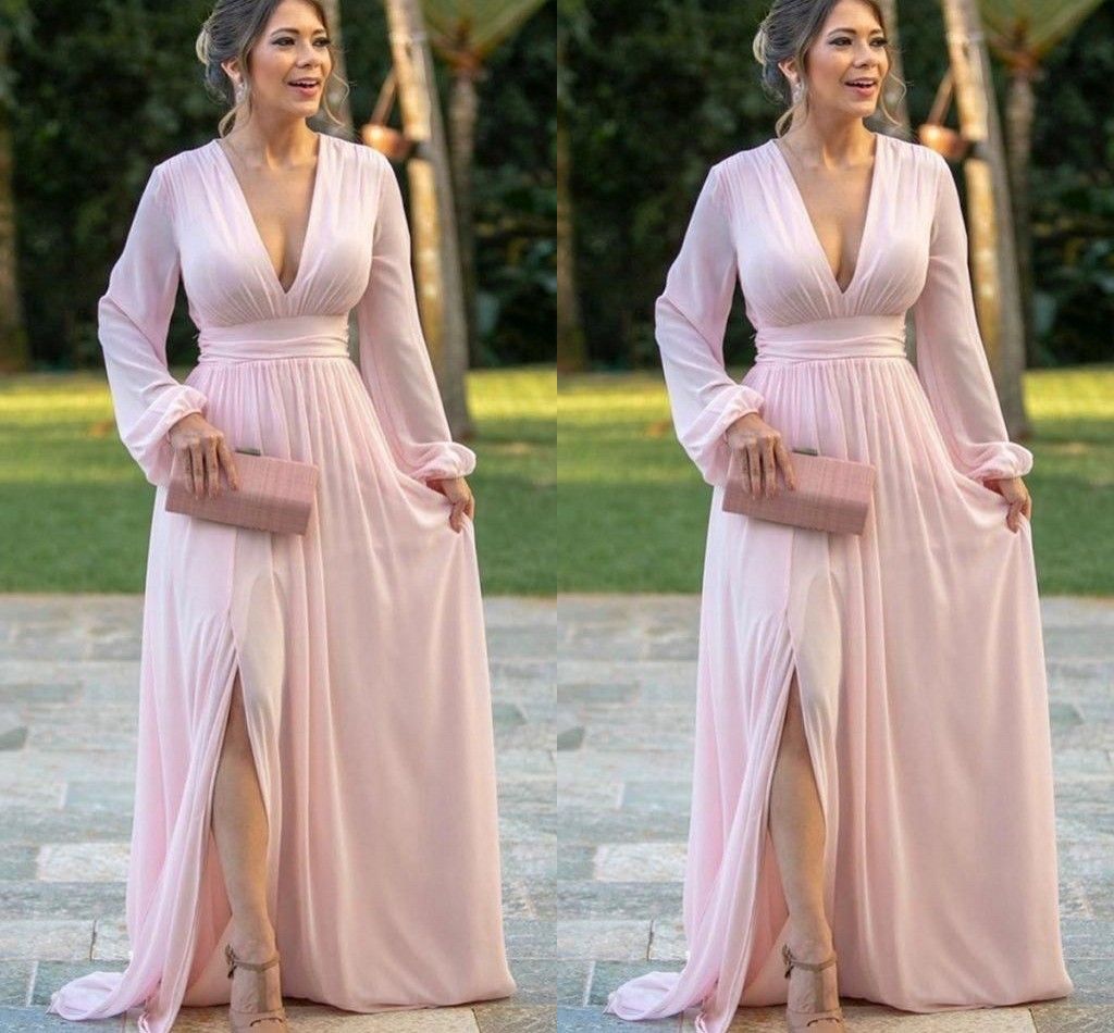 2020 Pink Poet Long Sleeve Groom Evening Dresses Deep V Neck Side