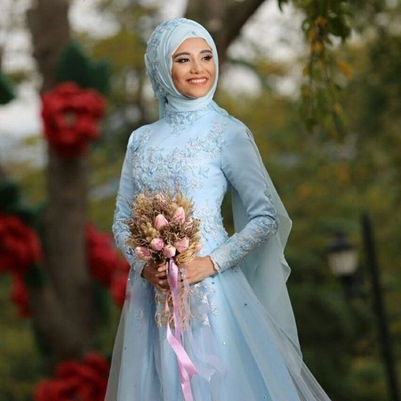 Glamorous Sky Blue Muslim Wedding Dress Long Sleeves High Neck