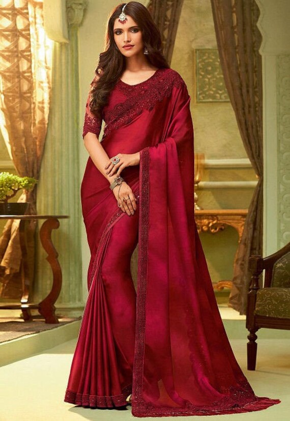Sabyasachi Wedding Satin Georgette Saree In Maroon Heavy Party Etsy