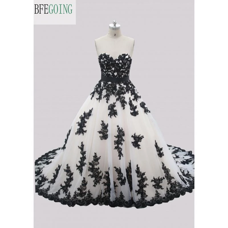 Tulle Black Lace Appliques Floor Length A Line Wedding Dress Court