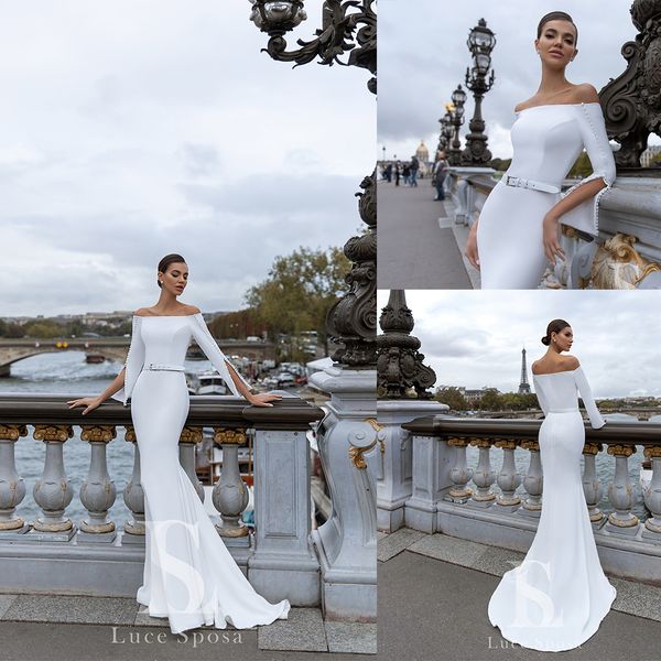2020 White Mermaid Wedding Dresses Bateau Neck Button Beaded Split