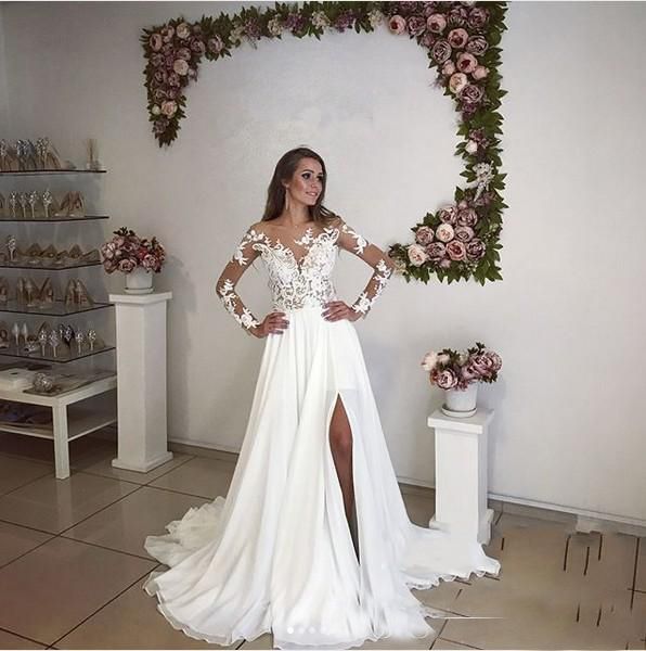 Discount Long Sleeves Wedding Dresses With High Split Illusion