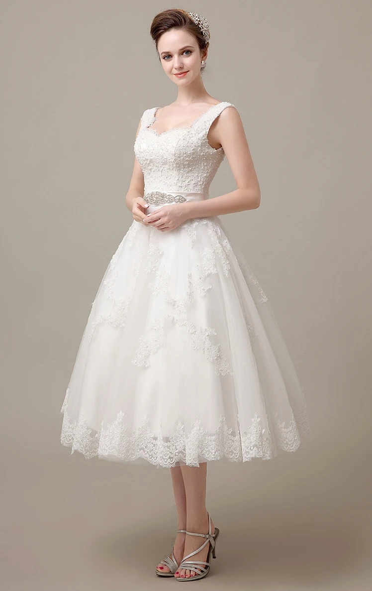 Ivory Wedding Dresses Tea Length 2019 Beaded Pearls Lace Ball Gown