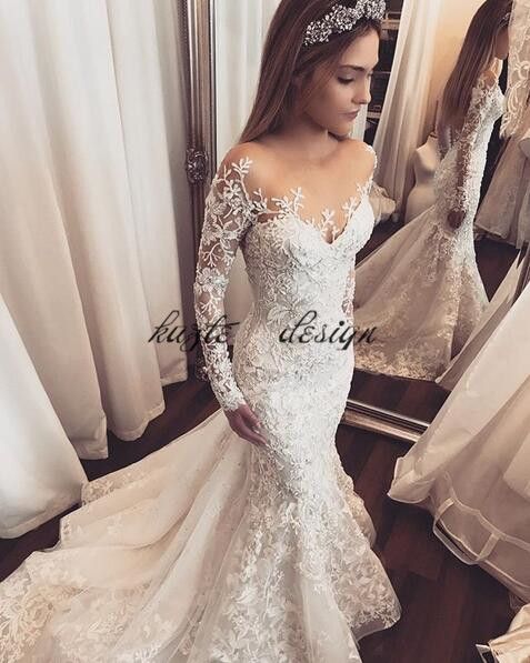 Lace Floral Mermaid Long Sleeve Wedding Dresses 2018 Sheer Neck