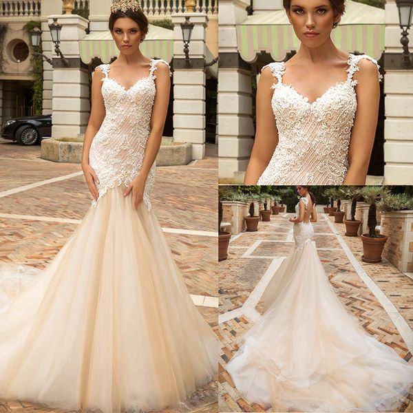 Champagne Lace Mermaid Wedding Dresses Spaghetti Straps Sexy Open