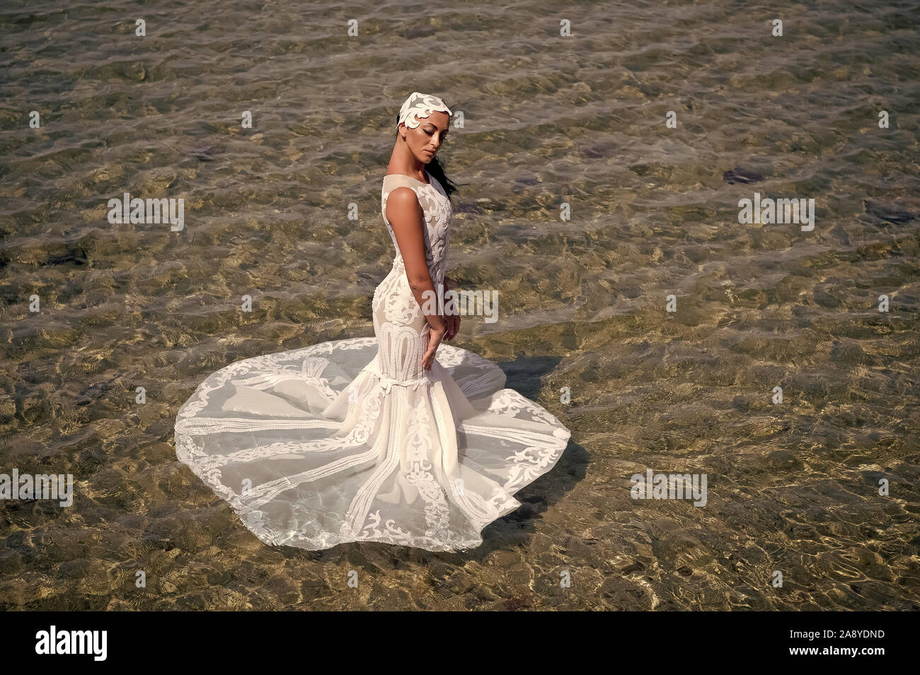 Wedding Ceremony Seashore Bride White Wedding Dress Stand In Sea