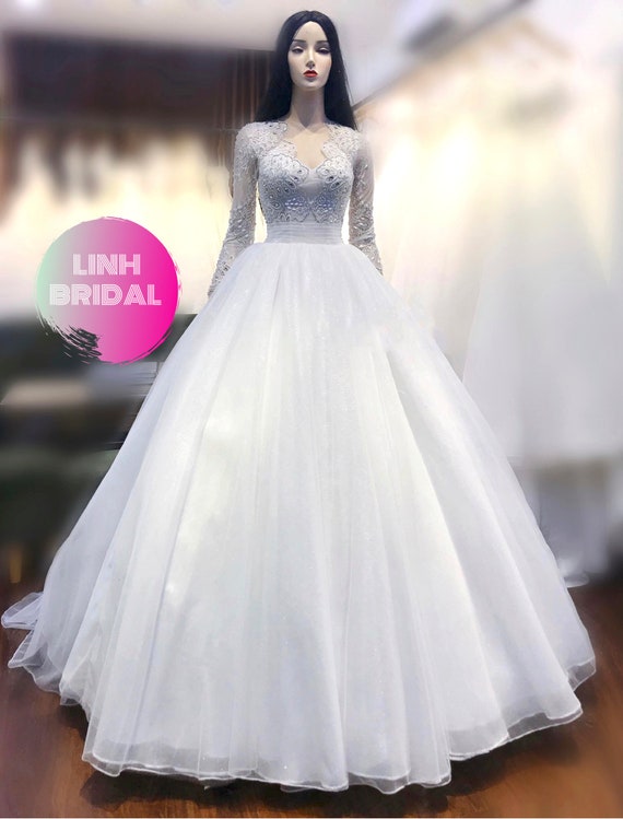 Elegant Long Sleeve Beaded White Wedding Ball Gown With Floral Etsy