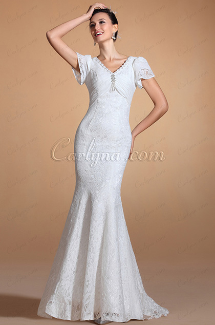 Rose Moda V Neck Mermaid Wedding Dress Half Sleeves Lace Wedding