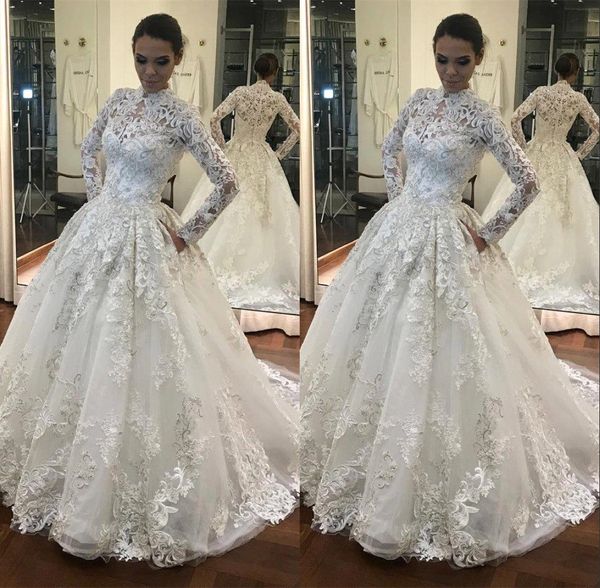 Modest High Neck Long Sleeve Lace Wedding Dresses Arabic Muslim A