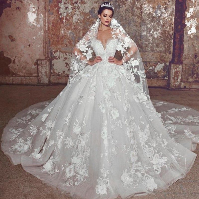 A Line Long Sleeve Floral Lace Wedding Dress With Plunging V