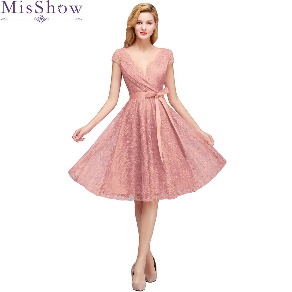 Sexy Elegant Short Sleeves Dust Pink V Neck Lace Short Dress