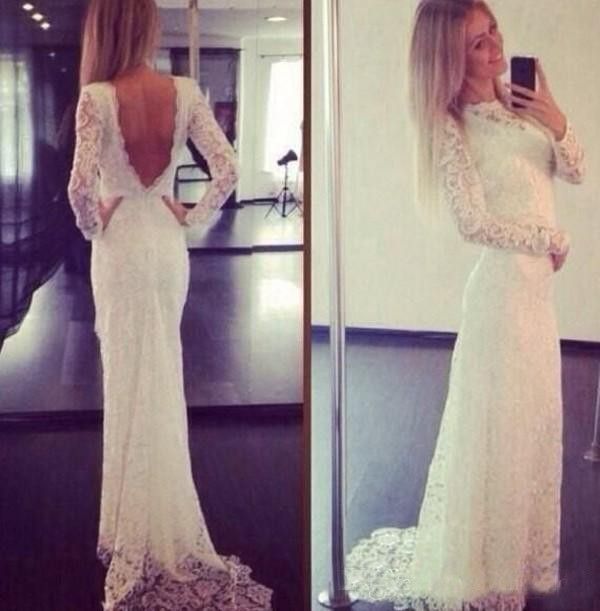 Long Sleeve Full Lace Fitted Prom Dress Illusion Neck V Back