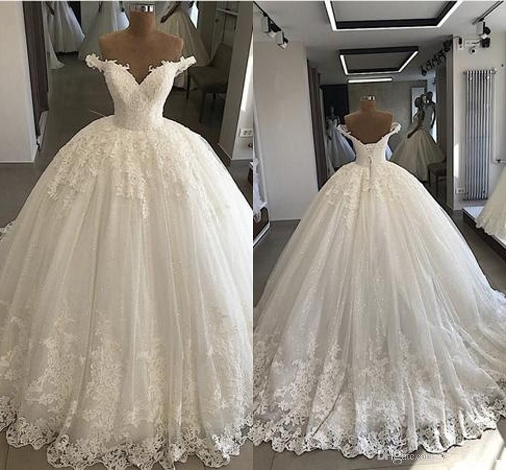 Pearl Beaded Lace V Neck Tulle Wedding Dresses Ball Gown Off
