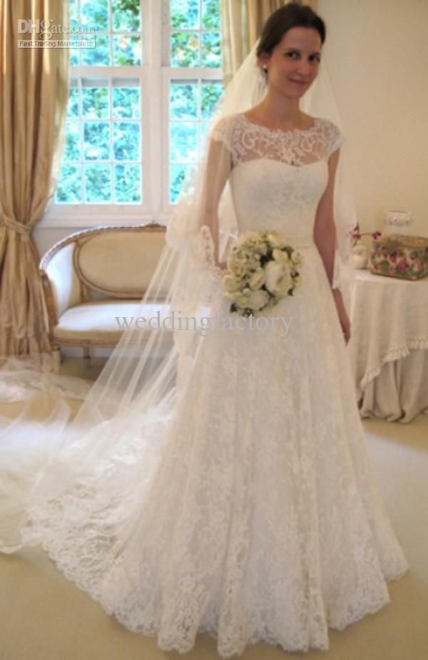 Hot Sale Charming Bateau Neck Lace Wedding Dresses A Line Cap