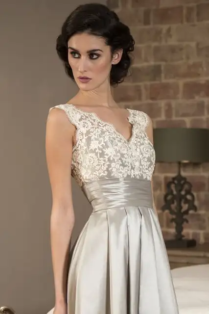 Elegant Tea Length Silver Lace Satin Bridesmaid Dresses For