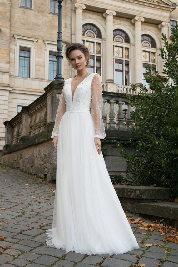 Boho Wedding Dress Simple Long Sleeves Modern Beads Pearls Etsy