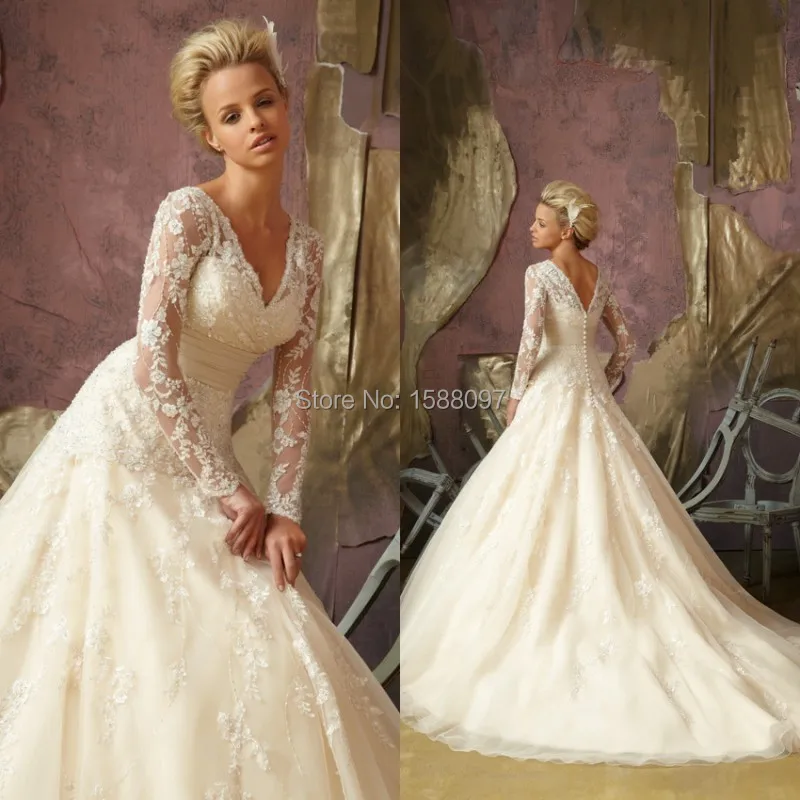 2016 Sexy New Fashion Long Sleeves Wedding Dress Light Champagne V