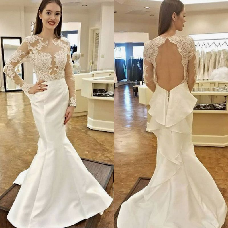 2019 Unique Long Sleeves Mermaid Wedding Dress Lace Open Back