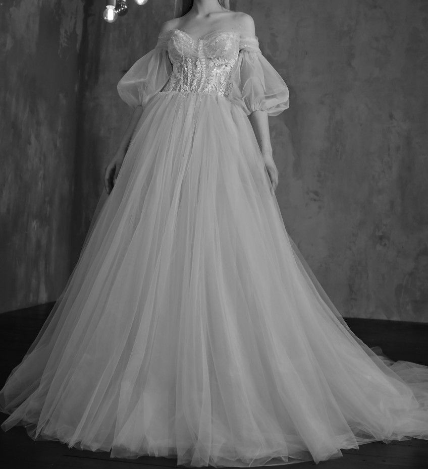 Tulle Off Shoulder Princess Long Puff Sleeves Wedding Dress With